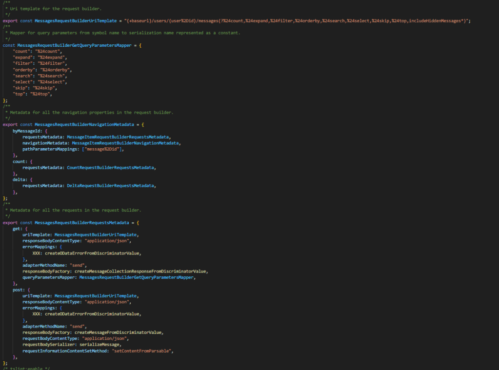 If you take a look at this code which is for the /users/{id}/messages endpoint. You have a full request builder which defines the entire endpoint. It defines what metadata exists on a request, which OData operators are supported, etc. Every endpoint will have the same exact structure, even if, for example, the same QueryParameters exist on that other endpoint. It will be duplicated.